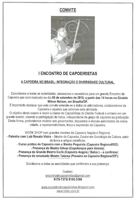 No dia 05 de setembro de 2010 foi realizado no Ginásio Nilson Nelson, em Brasília, o I Encontro de Capoeiristas - Capoeira no Brasil: Integração e Diversidade Cultural que contou com Palestras com Mestre Luiz Renato e Mestre Tabosa, Aulão com o mestre Piquinês (GO), Capoterapia com Mestre Gilvan e a Roda com diversos Capoeiristas de diversos Grupos.